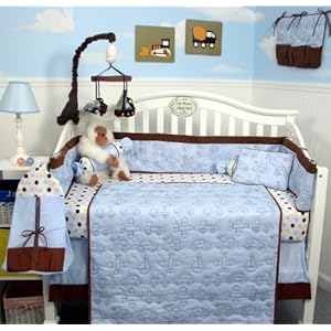 The SoHo Blue Stitch Traveler Baby Crib Bedding Set comes with these 10 pieces: Comforter and 4 sided Bumper (both items are reversible, Dust Ruffle, Fitted Crib Sheet, Baby Bib, Toy Bag, 2 valances, Diaper Stacker and Baby Pillow! Features are soft corduroy, polka dot designs, hand stitching, embroidery, appliques, super soft cotton fabrics with many textures.